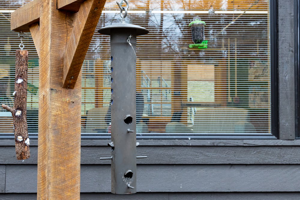 It’s also important to manage the area around feeders. Be sure to place feeders in ways that minimize the likelihood that birds will fly into windows. For instance, avoid providing a sight line through a house, which birds may perceive as a corridor, and break up window reflections with decals.