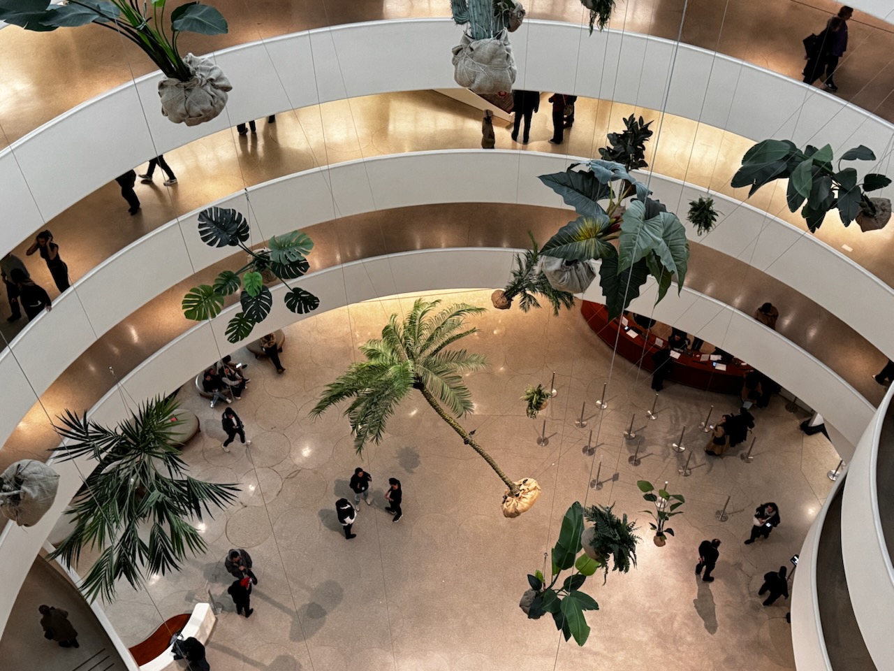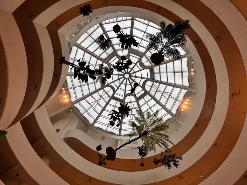 The use of flora is deeply entwined with Johnson’s exploration of Black identity and diasporic experience. Many of the plants—such as tropical philodendrons, palms, and rubber trees—are species often found in Black domestic spaces, particularly in the homes of Johnson’s parents and grandparents. In these contexts, they were more than ornamental; they were acts of care and connection, a means of cultivating beauty and control within environments shaped by systemic exclusion. By bringing these plants into the rarefied space of the Guggenheim, Johnson elevates what has historically been considered “ordinary” into the realm of high art, challenging entrenched hierarchies about what—and whose—cultural expressions belong in museums.