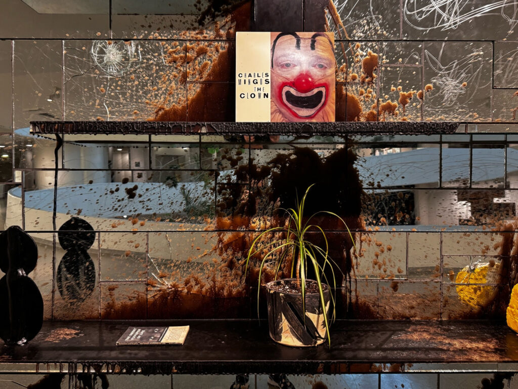 Among the most evocative elements of the exhibition are the living potted plants that punctuate this sculptural installation; these lush, sprawling presences transform the museum’s white rotunda into something far more organic, fantastic, and alive. At first glance, the plants might seem like mere aesthetic gestures, softening the hard edges of metal scaffolds or mingling with books and shea butter on his trademark “shelving units.” But their role is far more profound. In Johnson’s visual vocabulary, plants, like black soup, shea butter, and vinyl albums, are not decorative; they are conceptual anchors, living symbols of resilience, displacement, and the enduring search for home.
